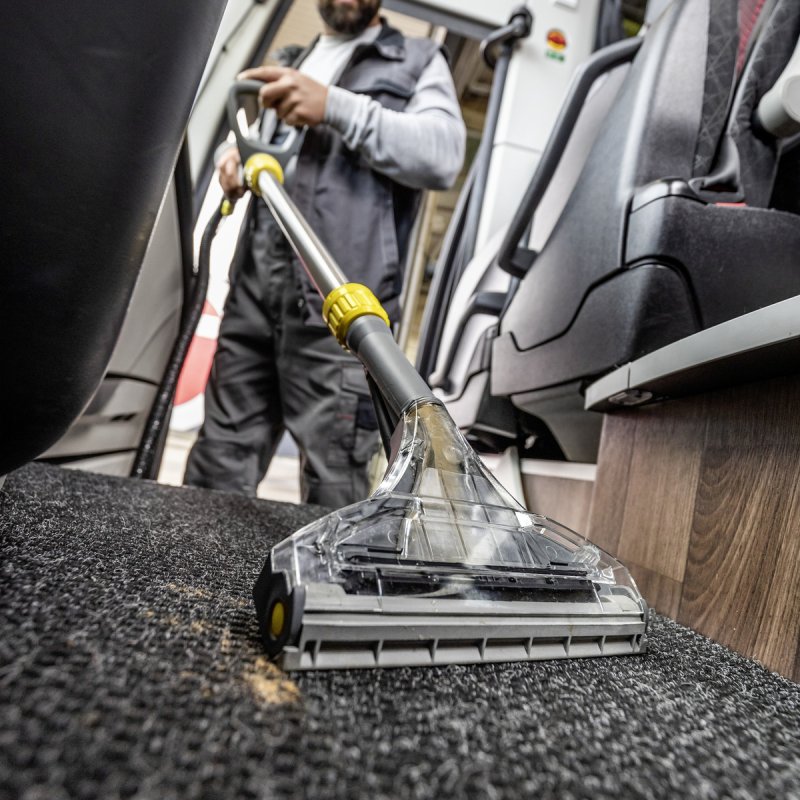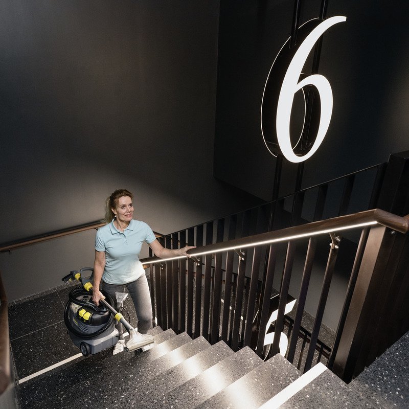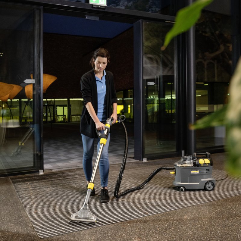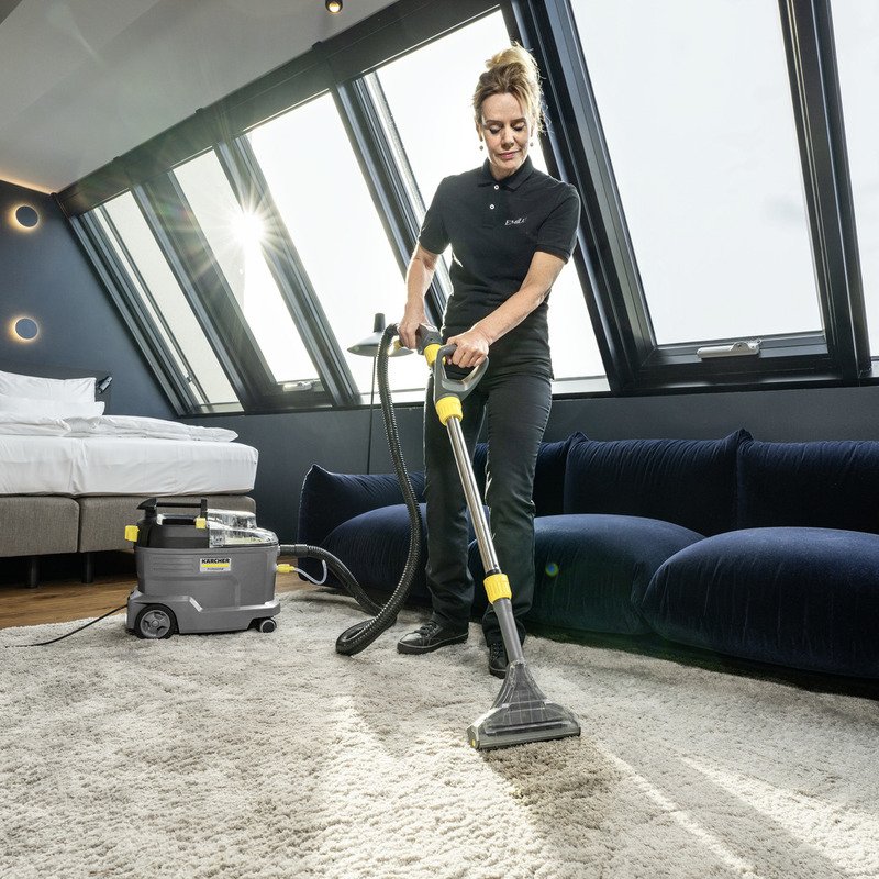 Kiemelkedő szívási teljesítményének köszönhetően a Kärcher professzionális Puzzi 8/1 Adv permet-extrakciós tisztítója kiváló és higiénikus tisztítási eredményeket biztosít, valamint gondoskodik arról, hogy a megtisztított textilfelületek gyorsan újra használhatók legyenek. A gép a tisztítószert mélyen a textilszálakba permetezi, majd eltávolítja azt a fellazított szennyeződésekkel együtt, így tökéletesen alkalmas kárpitok, szőnyegek és egyéb textilfelületek tisztítására. Masszív, kompakt kialakítása hosszú élettartamot és ezáltal rendkívüli költséghatékonyságot biztosít – ideális építőipari vállalkozók számára, szállodai és vendéglátói szektorban vagy járművek belsejének tisztítására. A készülék fedele, a kárpitfej és a padlófej átlátszó, így jobban látható a szennyezett víz. A markolaton lévő kémlelőablak is ezt a célt szolgálja. A Puzzi 8/1 Adv kis súlyának és ergonomikus hordozófogantyújának köszönhetően egy kézzel is szállítható. A nagy, kézzel vagy lábbal is működtethető nyomógombok szintén hozzájárulnak a felhasználó kényelméhez.